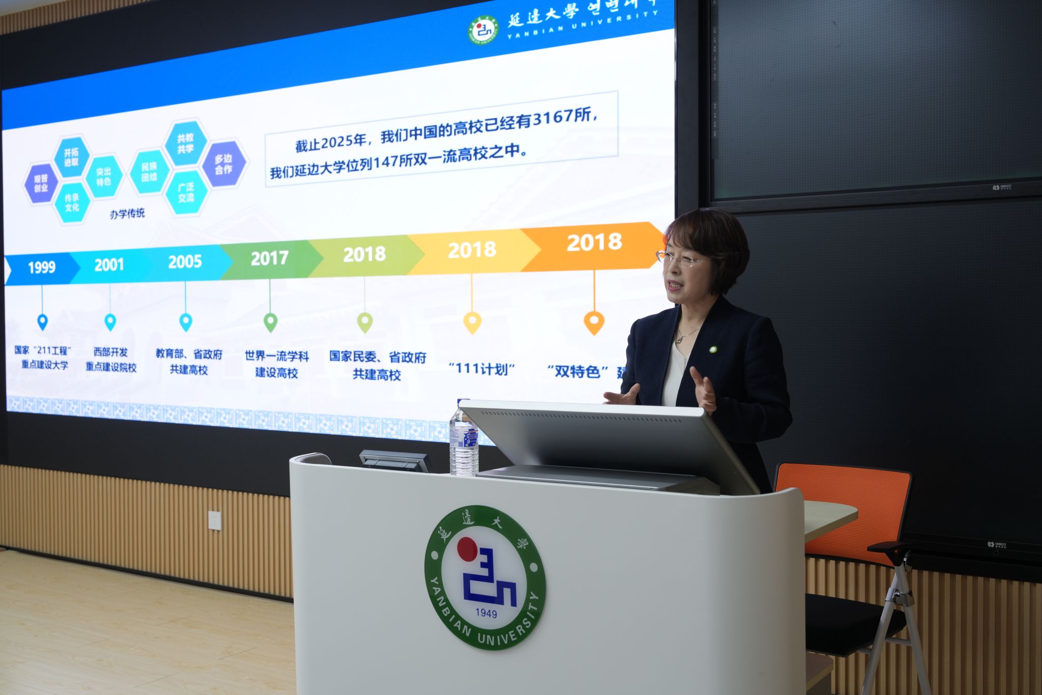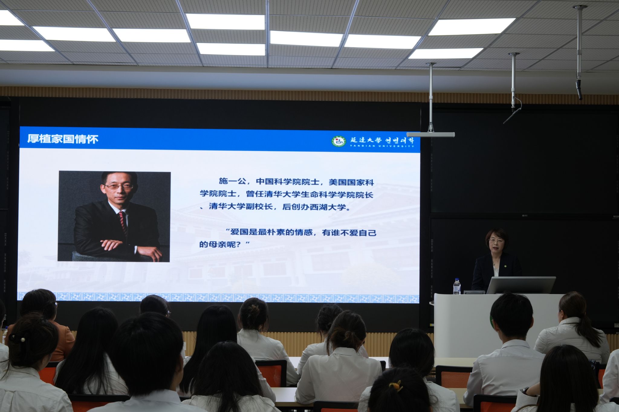 张玉红结合自身学习经历和延边大学优秀校友的先进事迹,从"建设教育强国的战略意义"出发,围绕"做心怀家国的延大人""做砥砺奋斗的延大人"“做求真至善的延大人"“做胸有乾坤的延大人"四个方面,深入浅出地阐述了新时代延大学子应有的理想信念与使命担当。她指出,建设教育强国是全面建成社会主义现代化强国的核心工程,高校是教育强国建设的重要阵地。因此,延边大学学子要秉承"求真、至善、融合"的校训,践行教育固边、科技强边、人才兴边、产业富边、学术戍边、文化润边的使命担当,找准自身定位,在实践中增强责任意识,把青春奋斗融入国家发展和边疆振兴大局。