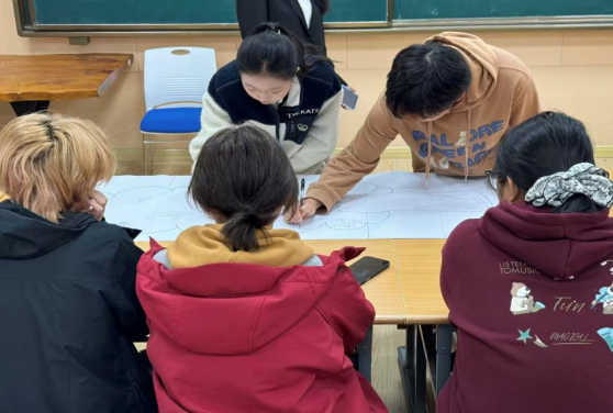 活动在“学院知多少”环节中拉开帷幕。新生们围坐成排,依次进行自我介绍,从姓名、专业到特长爱好,大家在轻松愉快的氛围中迅速熟悉彼此。紧接着,“倒说句子大挑战”将活动推向高潮。主持人口述短句,成员们需在短时间内倒序复述。从简单的三字词到复杂的长句,难度层层递进,现场气氛紧张而热烈。最后,“共创学院愿景树”环节让活动充满了温情。一张巨大的海报上,一棵光秃秃的大树等待新生们添枝加叶。大家纷纷上前,在海报上画下属于自己的叶子,写上名字、专业、对学院的祝福和期望,甚至将入学以来的困扰也写在树干上。